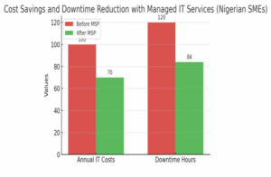 A simple bar chart comparing “Before MSP” and “After MSP” for average annual IT costs and downtime hours among Nigerian SMEs.